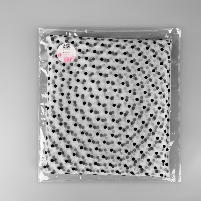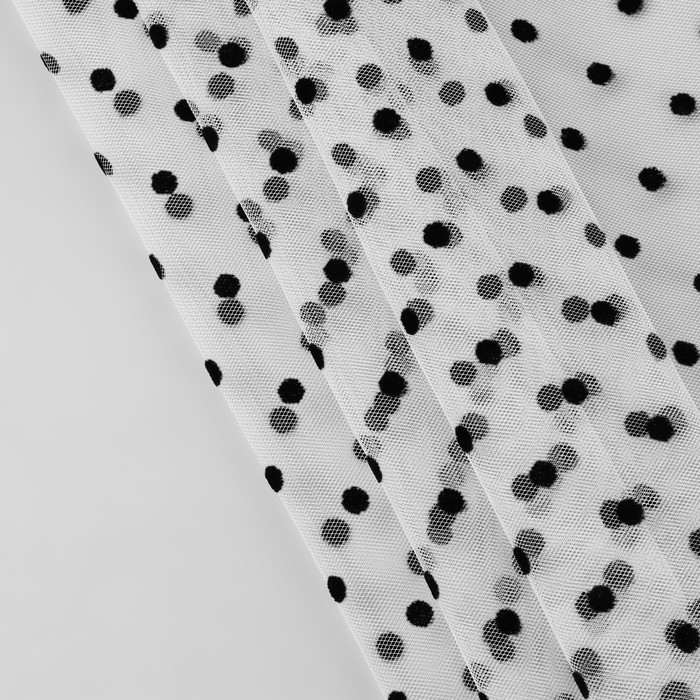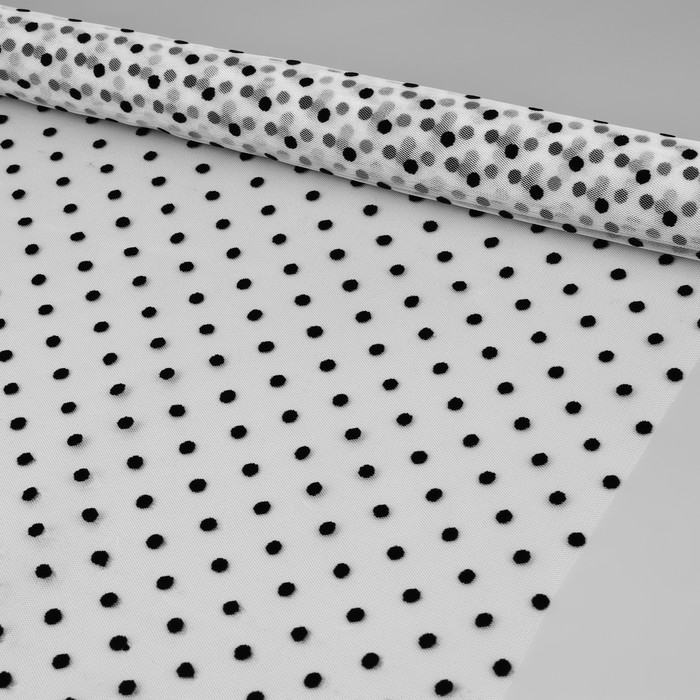 Сетка с флоком «Горох» сочетает в себе элегантность и приятную текстуру. Благодаря своей лёгкости и прозрачности она используется для создания объёмных воздушных дизайнов, вечерних нарядов, аксессуаров для волос, декоративных подушек или других элементов интерьера.