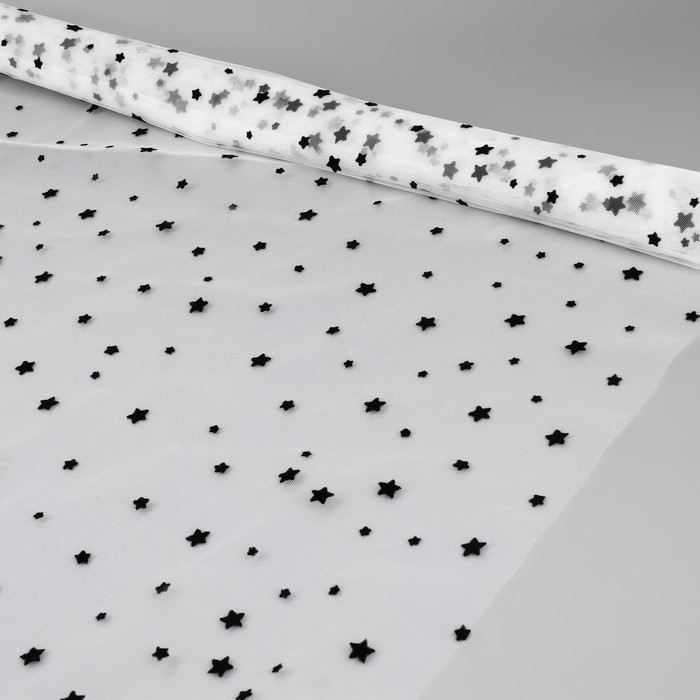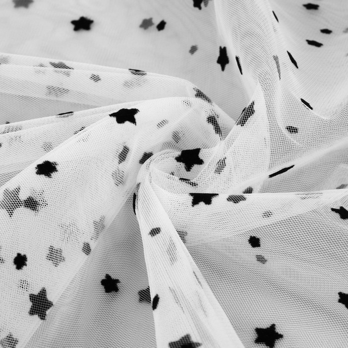Сетка с флоком «Звёзды» сочетает в себе элегантность и приятную текстуру. Благодаря своей лёгкости и прозрачности она используется для создания объёмных воздушных дизайнов, вечерних нарядов, аксессуаров, декоративных элементов или карнавальных костюмов.
