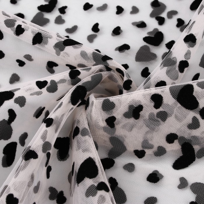 Сетка с флоком «Сердечки» сочетает в себе элегантность и приятную текстуру. Благодаря своей лёгкости и прозрачности она используется для создания объёмных воздушных дизайнов, романтических нарядов, аксессуаров, декоративных элементов или костюмов.