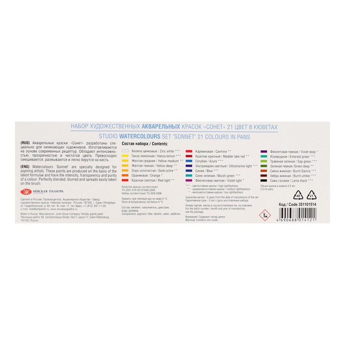Художественные акварельные краски "Сонет" разработаны для начинающих художников, открывающих или совершенствующих свои творческие способности. Изготавливаются по современным рецептурам на основе преимущественно органических пигментов и синтетического связующего. Обладают интенсивностью цвета и прозрачностью. Превосходно смешиваются, размываются и легко берутся на кисть.