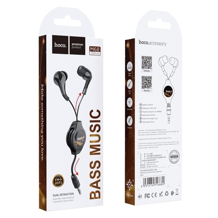 Наушники Hoco M68, проводные, вакуумные, 65 см, чёрные