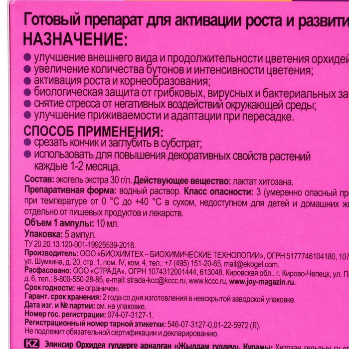 Готовый препарат для активации роста и развития орхидей. Активирует рост и корнеобразование, восстанавливает ослабленные растения, увеличивает количество бутонов, улучшает внешний вид и продолжительность цветения. Использовать в качестве подкормки каждые 1-2 месяца. Состав: водный раствор геля хитозана на основе молочной кислоты (0,45г/л)Назначение:улучшение внешнего вида и продолжительности цветения орхидей;увеличение количества бутонов и интенсивности цветения;активация роста и корнеобразования;биологическая защита от грибных, вирусных и бактериальных заболеваний;снятие стресса от негативных воздействий окружающей среды;Преимущества:экологически безопасный продукт;не содержит гормонов роста;видимый эффект через 2-3 дняСпособ применения: перед использованием встряхнуть флакон. Равномерно распылять спрей на сухие листья и корни растения 1 раз в 14 дней, избегая попадания раствора на цветки орхидей. В зимнее время интервал между обработками следует увеличить до 30 дней.