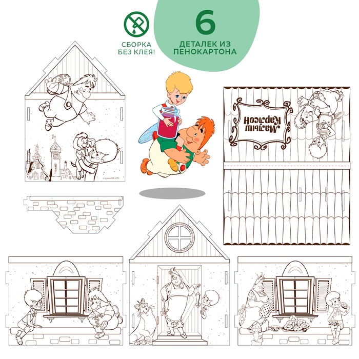 Набор для творчества «Домик-раскраска: Малыш и Карслон», из картона, 6 деталей, 5 фломастеров