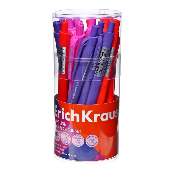 Карандаш механический 0,5 мм ErichKrause "Caribbean Sunset" НВ, с ластиком, трехгранный корпус Soft-touch, тубус, микс