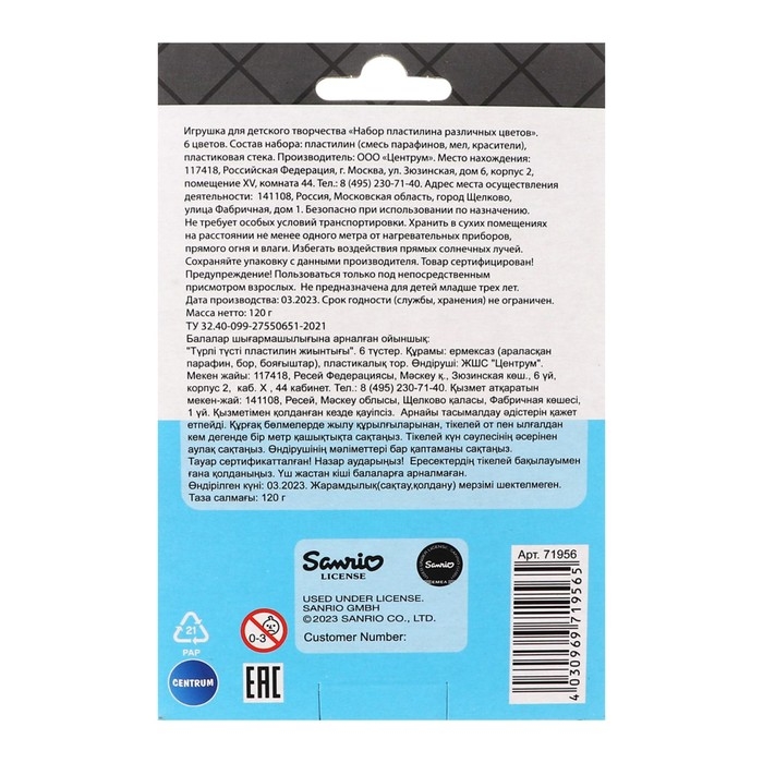 Пластилин 6 цветов 120 г Hello Kitty&friends, пластиковая стека, в картонной упаковке с европодвесом