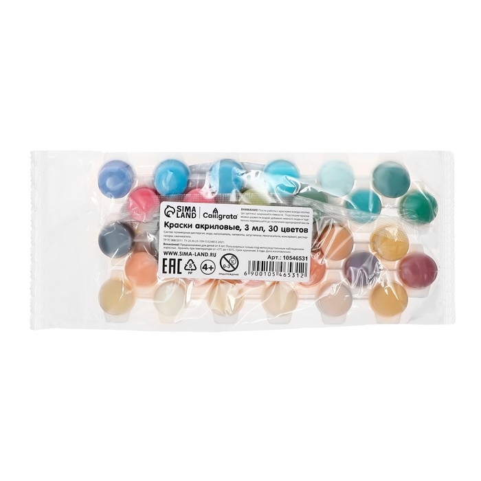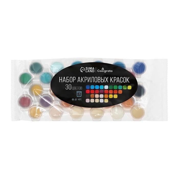 Краска акриловая, набор 30 цветов х 3 мл, Calligrata, в пакете, морозостойкая