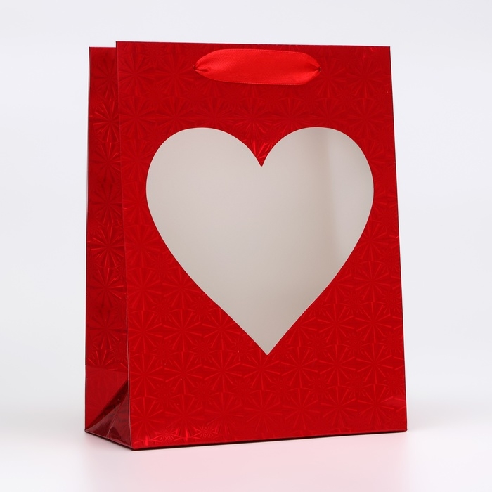 Пакет подарочный, фольгированный, упаковка, с окном "Сердце", "Красный", S 23,5 х18 х 8,5 см