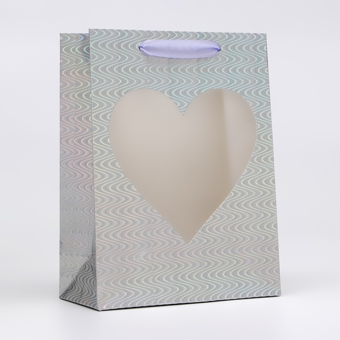 Пакет подарочный, фольгированный, упаковка, с окном "Сердце", "Серебряный" S 23,5 х18 х 8,5 см