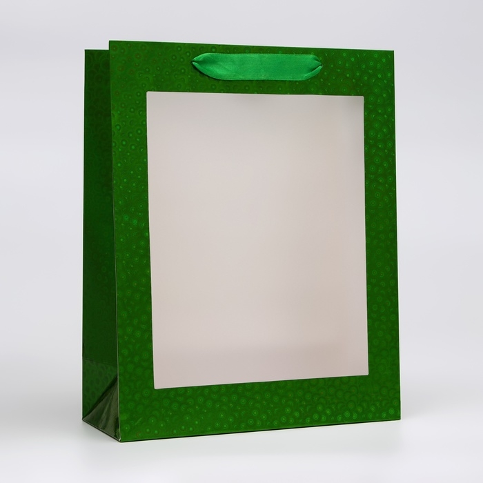 Пакет подарочный, фольгированный, упаковка, с окном, "Зеленый", M 32 х 25,5 х 11 см