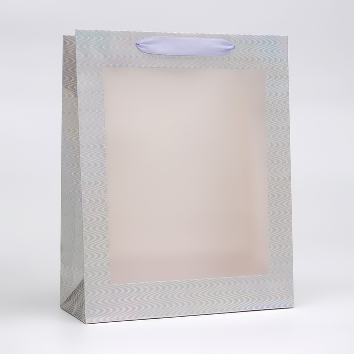 Пакет подарочный, фольгированный, упаковка, с окном, "Серебряный", M 32 х 25,5 х 11 см