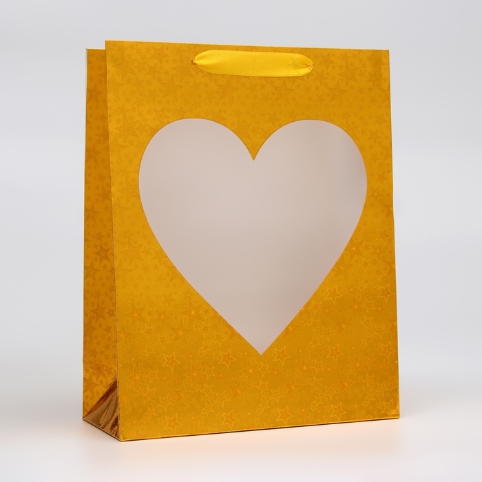 Пакет подарочный, фольгированный, упаковка, с окном "Сердце", "Золотой", M 32 х 25,5 х 11 см