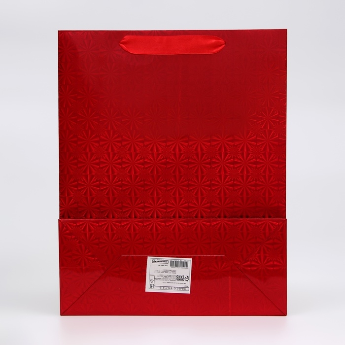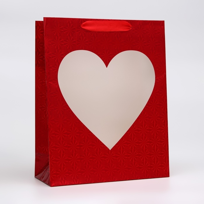 Пакет подарочный, фольгированный, упаковка, с окном "Сердце", "Красный", M 32 х 25,5 х 11 см