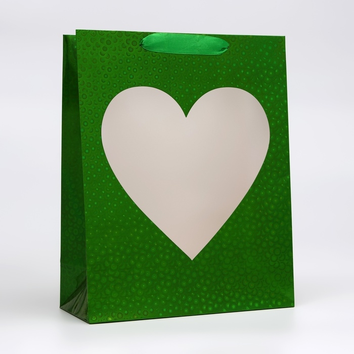 Пакет подарочный, фольгированный, упаковка, с окном "Сердце", "Зеленый", M 32 х 25,5 х 11 см