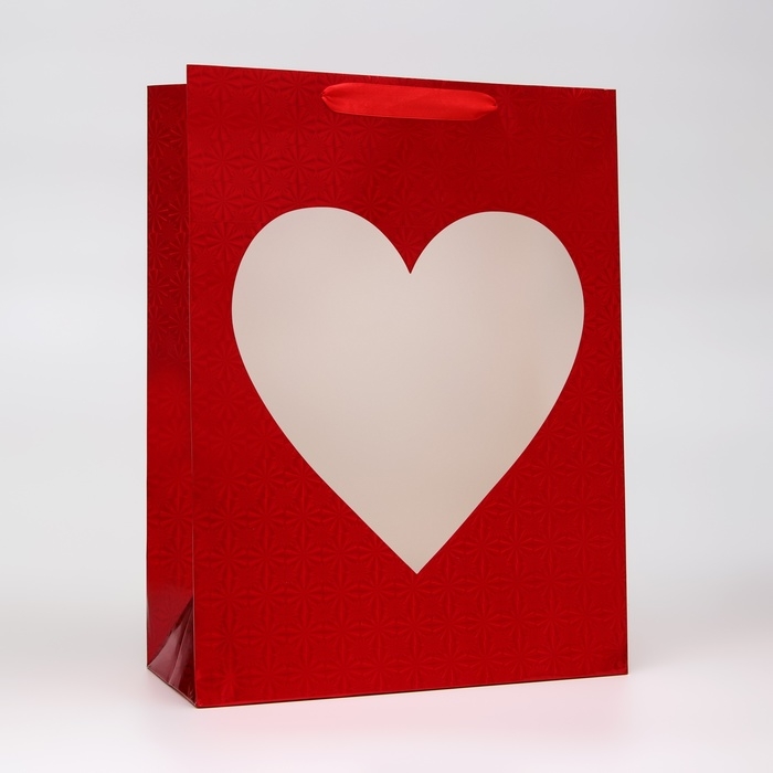 Пакет подарочный, фольгированный, упаковка, с окном "Сердце", "Красный", L 40 х 30 х 13 см