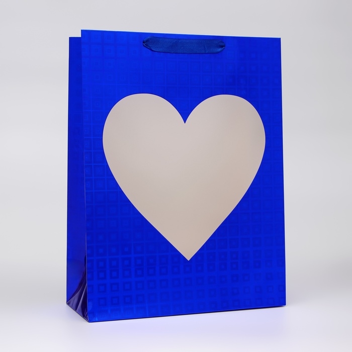 Пакет подарочный, фольгированный, упаковка, с окном "Сердце", "Синий", L 40 х 30 х 13 см