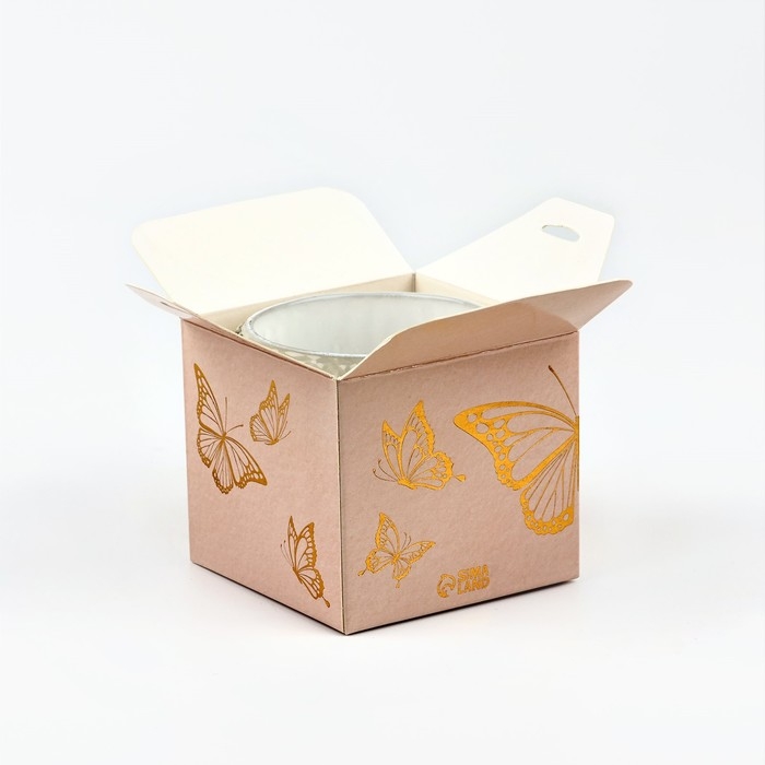Свеча упакована в красивую подарочную коробку с изображением бабочек.