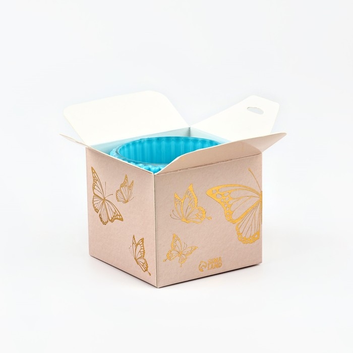 Упаковка изготовлена из плотного картона светло-бежевого цвета. На коробке изображены золотые бабочки и надпись “For you” и “Aroma Candle”.