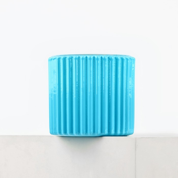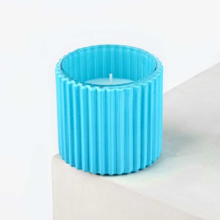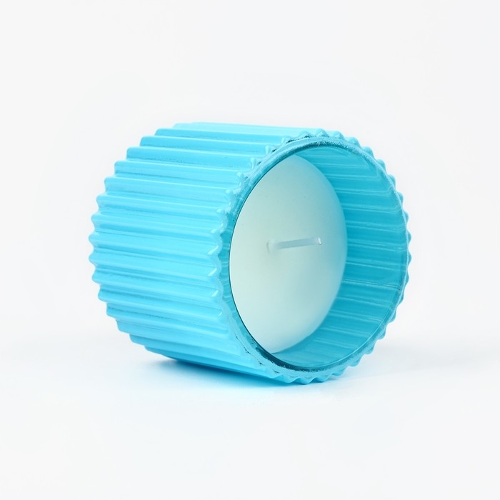 Свеча имеет размер 6,5 х 7,2 см. Стеклянный подсвечник выполнен в голубом цвете с рельефными вертикальными линиями.