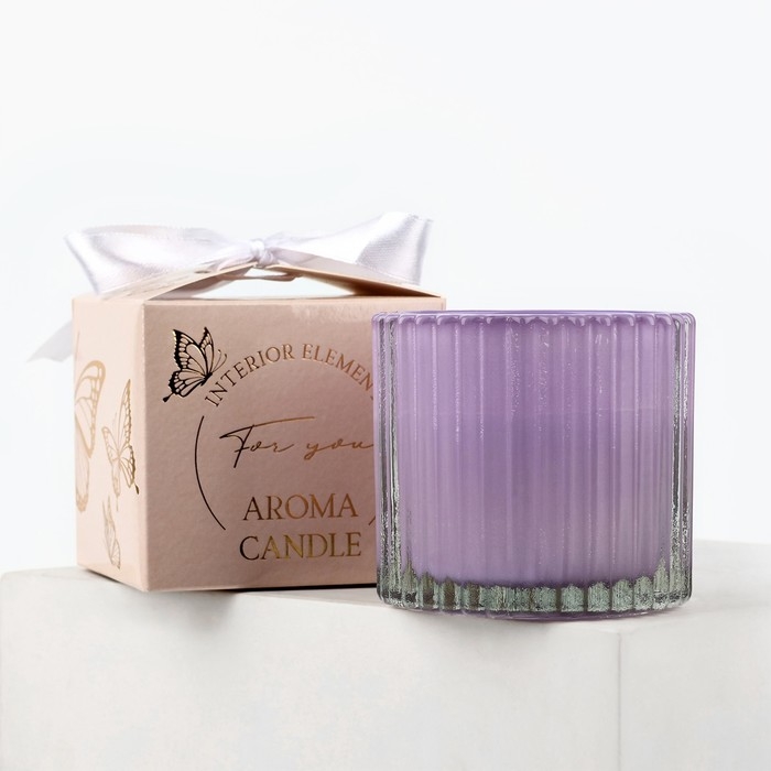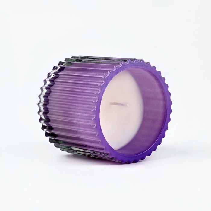 Свеча имеет светло-лиловый цвет, на стекле рифленые полоски.