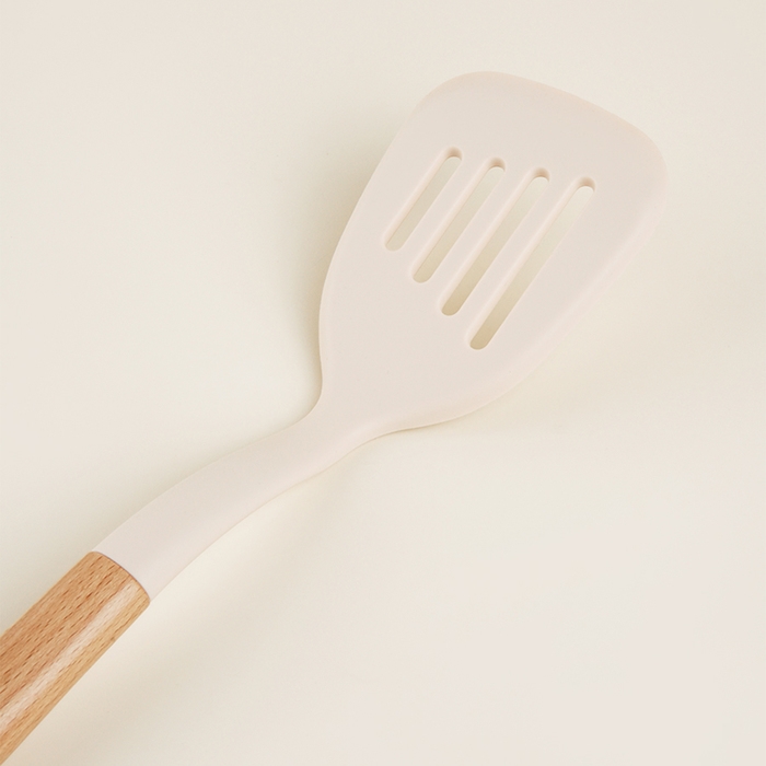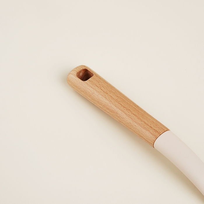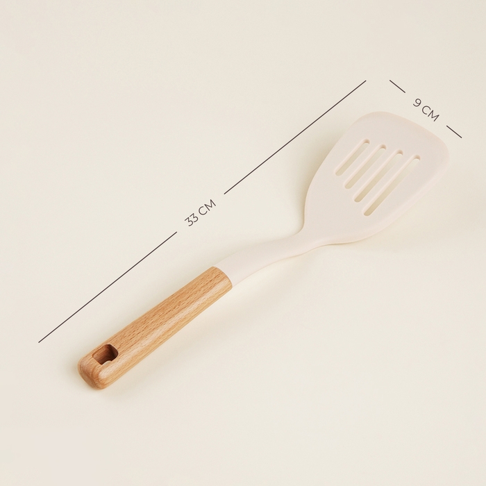 Силиконовая рабочая часть лопатки обеспечивает бережное обращение с любыми поверхностями, предотвращая повреждения даже на деликатной посуде. Деревянная ручка из бука, эргономично лежащая в руке, гарантирует комфортное использование, а бежевый цвет подчеркивает природную эстетику вашего пространства.