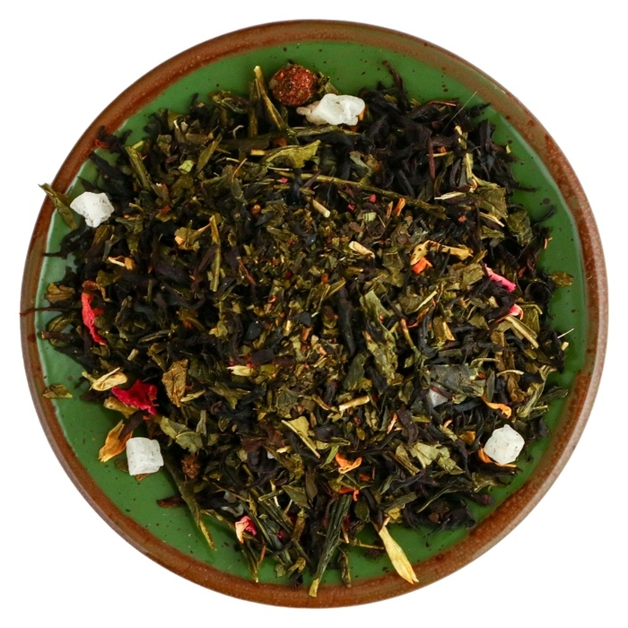Чай 1000 and 1 night - это сочетание смеси зелёного чая Сенча и чёрного цейлонского чая с добавлением вяленого винограда, кусочков ананаса, лепестков розы и календулы. Этот чай обязательно подарит Вам незабываемое удовольствие и ощущение бодрости, легкости и свежести!