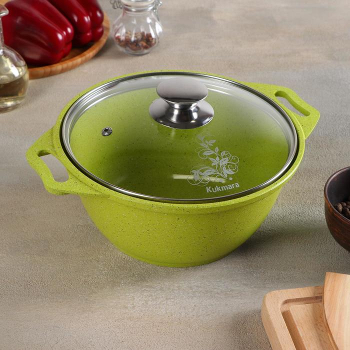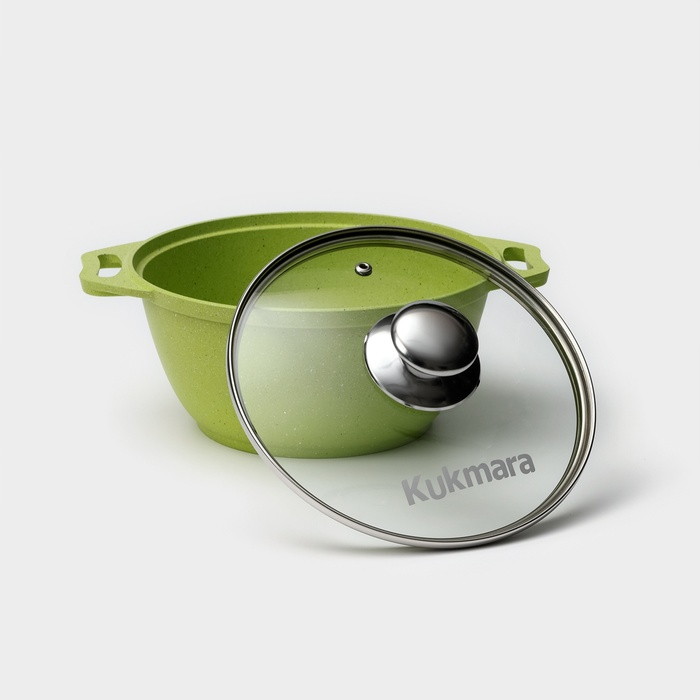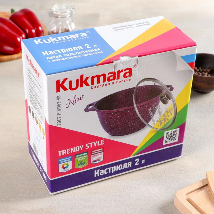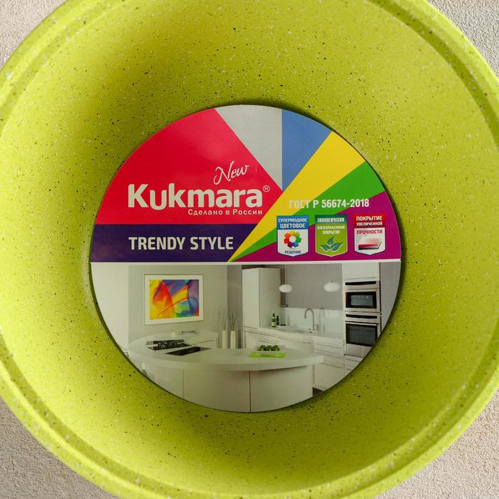 Посуда линии Trendy style разработана в соответствии с последними модными тенденциям. Кастрюля Kukmara сделана из литого алюминия, с внутренней и внешней стороны — антипригарное покрытие увеличенной прочности, изготовлено на водной основе по немецким технологиям.