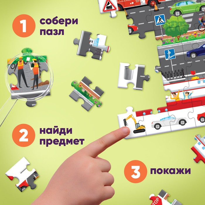 Собирайте фрагменты в одно целое, находите персонажей и предметы, а также обсуждайте с ребёнком то, что происходит на изображении. В этом вам поможет лупа из безопасного пластика - её вы найдёте в коробке.