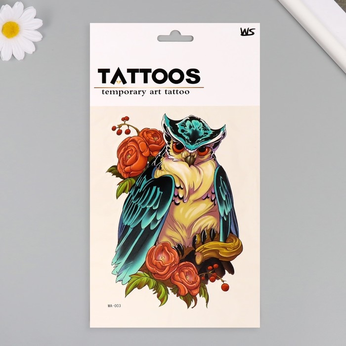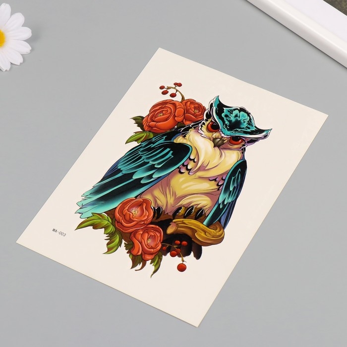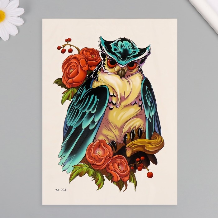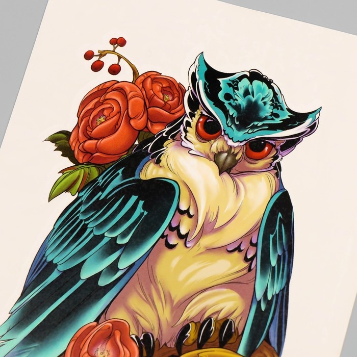 Татуировка на тело цветная "Сова в пионах" 26,1х14,6 см