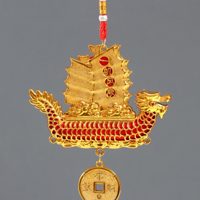 Подвеска пластик, текстиль "Лодка Дракон с китайской монетой" 1,8х13х39 см