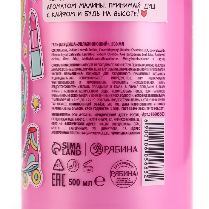 Гель для душа, увлажнение, 500 мл, аромат малины, TeenBee