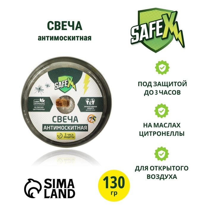 Свеча антимоскитная SAFEX - это эффективное средство для защиты от комаров и других насекомых. Продукт разработан с учетом современных технологий и научных исследований, чтобы обеспечить максимальную защиту от назойливых насекомых.Свеча антимоскитная SAFEX обладает приятным ароматом, что делает ее более привлекательной для использования в домашних условиях или на открытом воздухе. Продукт представлен в удобной упаковке, что обеспечивает легкость в использовании и хранении.Особенности свечи антимоскитной SAFEX:Эффективная защита от комаров и других насекомых.Длительное действие благодаря высокой концентрации активного ингредиента.Приятный аромат, что делает использование более комфортным.Удобная упаковка для легкости в использовании и хранении.Применение свечи антимоскитной SAFEX: свечу следует разместить на устойчивой поверхности, подальше от горючих материалов и легко воспламеняющихся предметов. После зажигания свечи, дайте ей время для равномерного распределения аромата и активного ингредиента. Не рекомендуется оставлять свечу без присмотра во избежание возможных пожаров.Свеча антимоскитная SAFEX - это надежное средство для защиты от комаров и других насекомых, которое обеспечивает эффективную защиту и комфорт во время пребывания на свежем воздухе или в помещении.Состав: смесь парафинов, фитиль, отдушка "цитронелла".