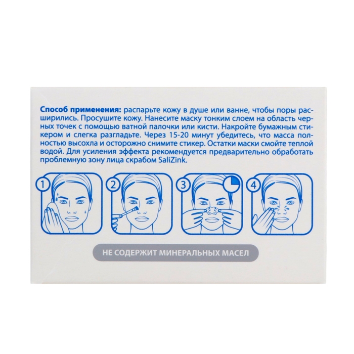 Способ применения: распарьте кожу в душе или ванне, чтобы поры расширились. Просушите кожу. Нанесите маску тонким слоем на область черных точек с помощью ватной палочки или кисти. Накройте бумажным стикером и слегка разгладьте. Через 10-15 минут убедитесь, что масса полностью высохла и осторожно снимите стикер. Остатки маски смойте теплой водой. Для усиления эффекта рекомендуется предварительно обработать проблемную зону лица скрабом SaliZink.