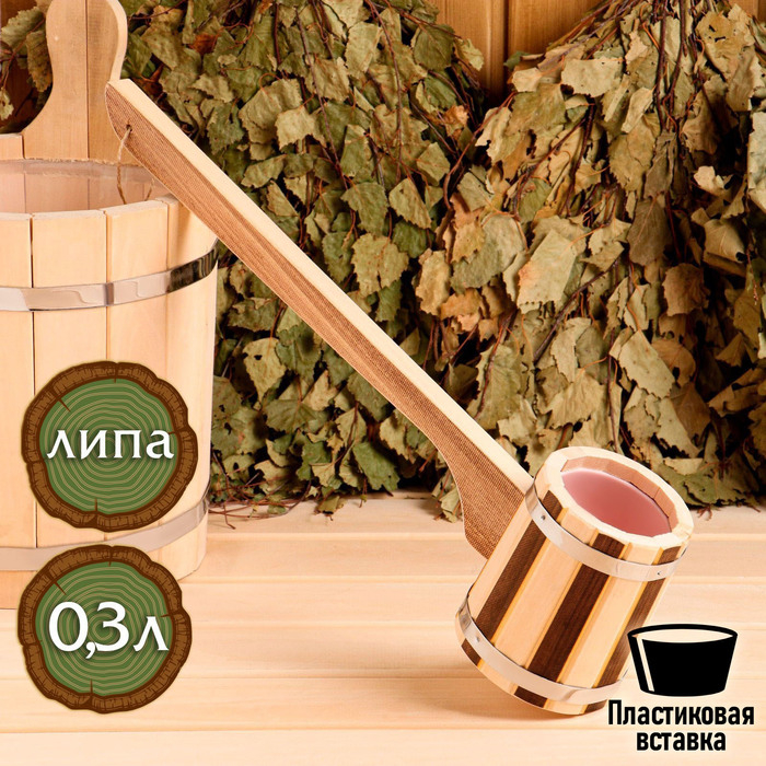 Ковш для бани из липы 0.9л, 51 см, нержавеющая вставка, с горизонтальной ручкой