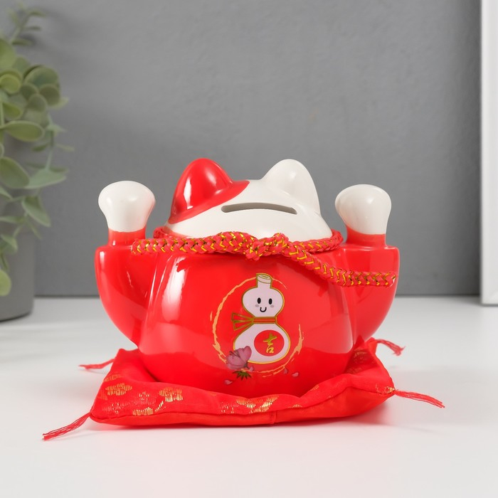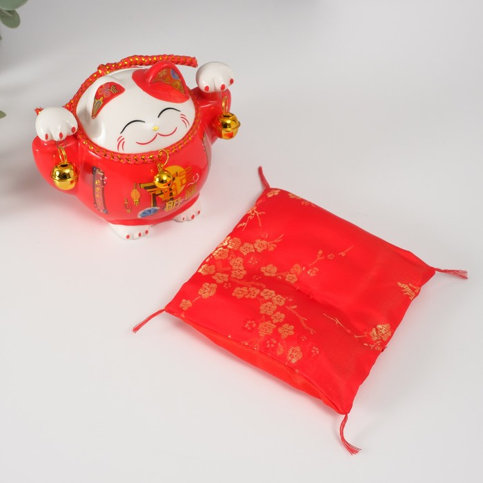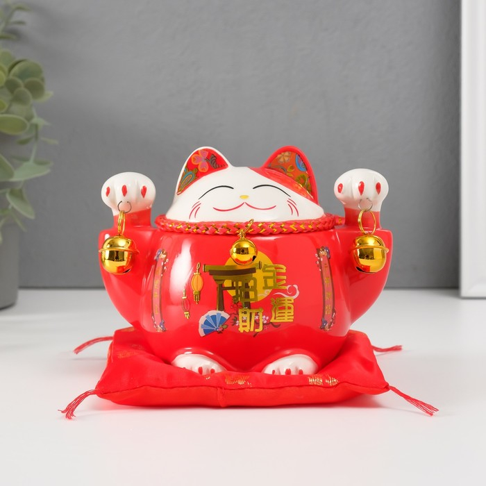Копилка керамика "Кот манэки-нэко красный с колокольчиками" 10,5х13,5х9 см