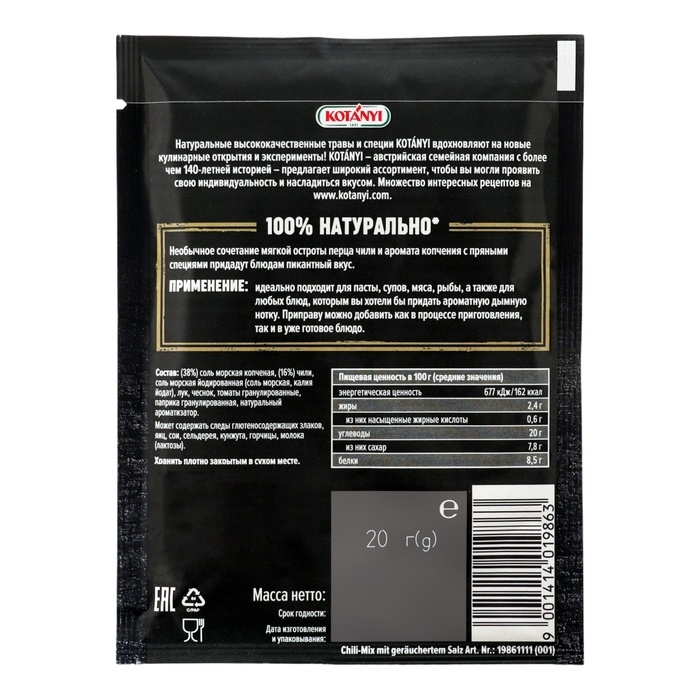 Приправа KOTANYI Чили с копченой солью – это необычное сочетание мягкой остроты перца чили и аромата копчения с пряными специями. Такой продукт придает блюдам пикантный вкус. Он идеально подходит для пасты, супов, мяса, рыбы, а также для любых блюд, которым хотелось бы придать ароматную дымную нотку. Приправу можно добавить как в процессе приготовления, так и в уже готовое блюдо.