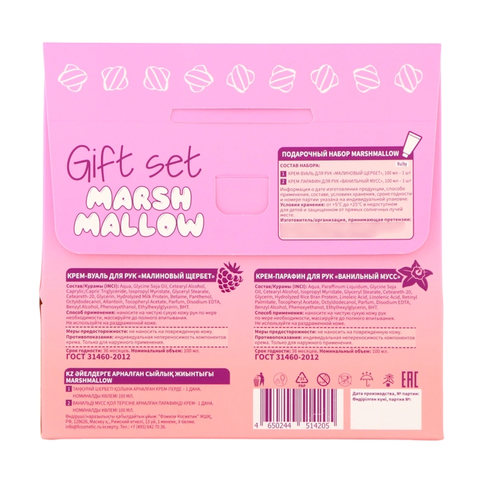 Подарочный набор для женщин Marshmallow включает в себя крем-парафин для рук, 100 мл и крем-вуаль для рук 100 мл. Крем-парафин увлажняет и питает кожу, а крем-вуаль придаёт ей ровный тон и улучшает внешний вид.