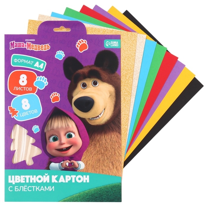 Картон цветной с блёстками, А4, 8 листов, 8 цветов, немелованный, двусторонний, в папке, 250 г/м², Маша и Медведь