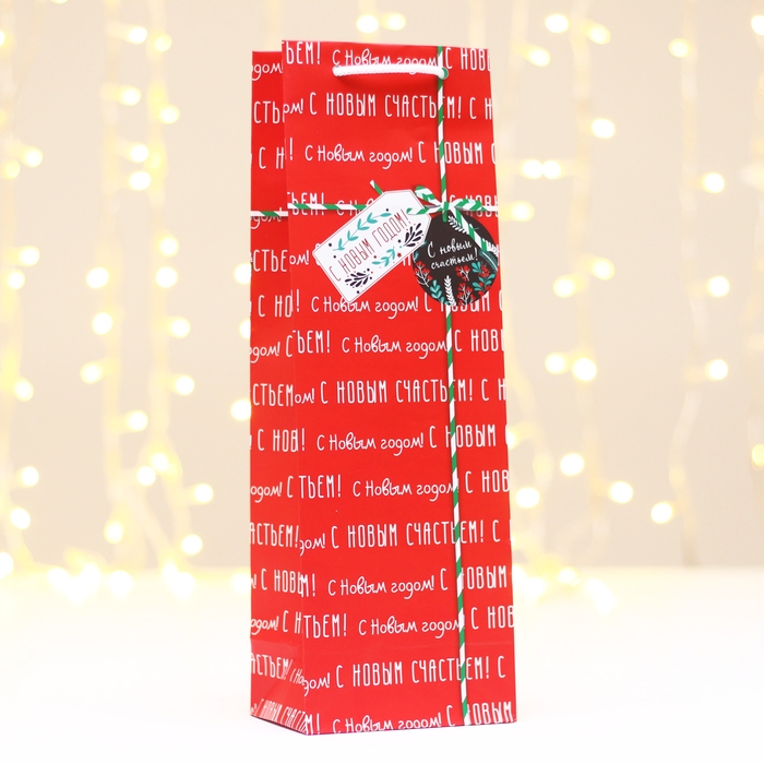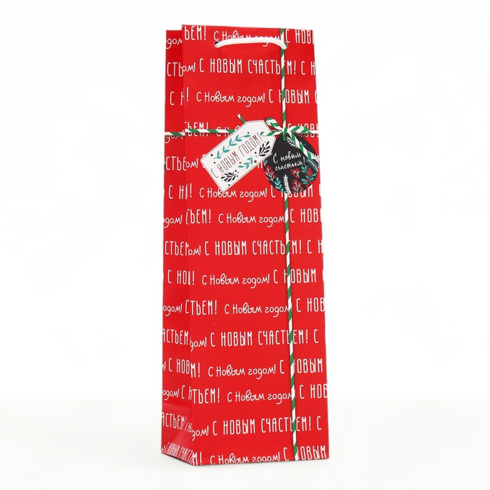 Новый год. Пакет подарочный "Надписи", красный, 12 х 36 х 8,5 см.