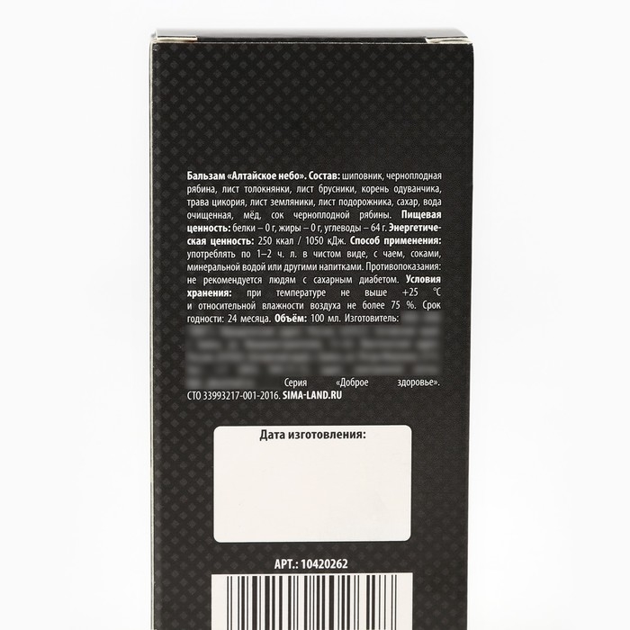 Состав: шиповник, черноплодная рябина, лист толокнянки, лист брусники, корень одуванчика, трава цикория, лист земляники, лист подорожника, сахар, вода очищенная, мёд, сок черноплодной рябины.