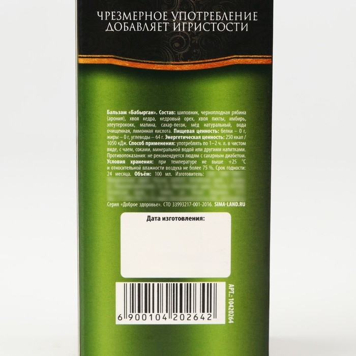 Состав: шиповник, черноплодная рябина (арония), хвоя кедра, кедровый орех, хвоя пихты, имбирь, элеутерококк, малина, сахар-песок, мёд натуральный, вода очищенная, лимонная кислота.