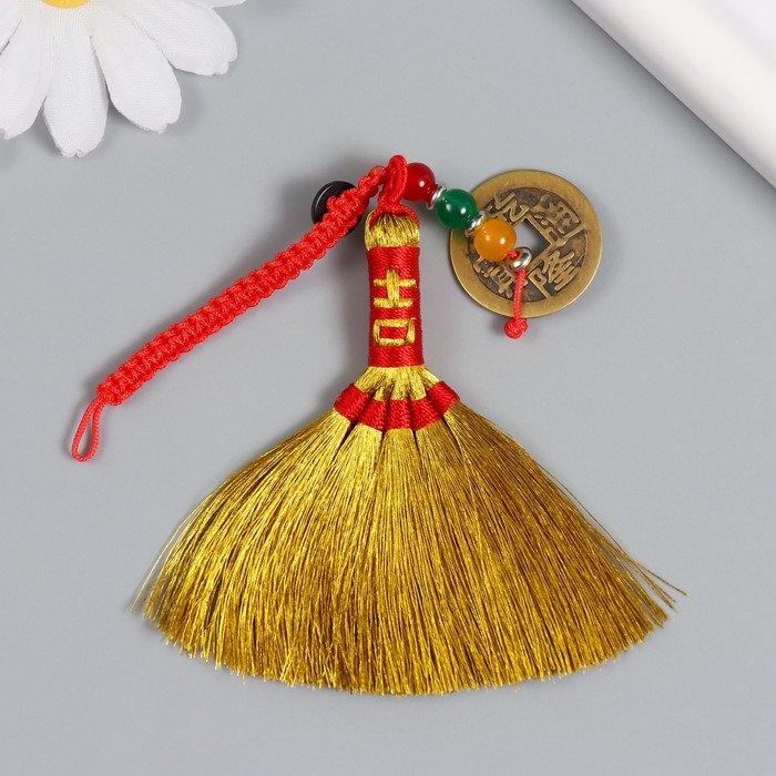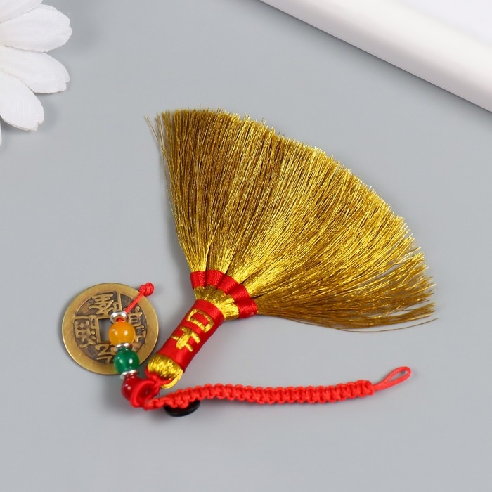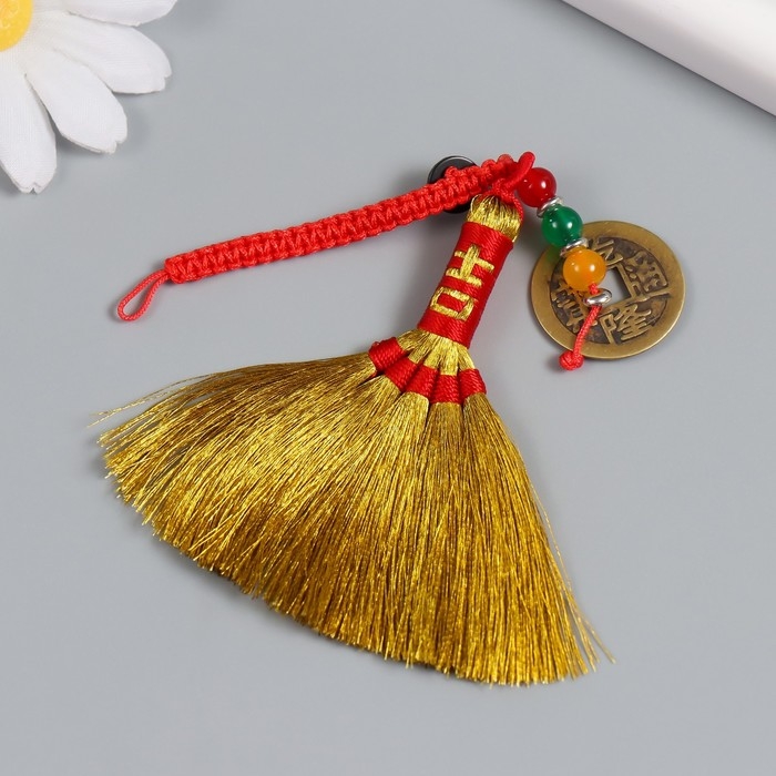 Подвеска текстиль, металл "Золотая метла с монеткой. Иероглиф - Счастье" 14,5 см