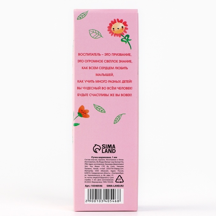 Ручка шариковая синяя паста пластик с колпачком «Воспитателю: Самый лучший воспитатель» 1.0 мм