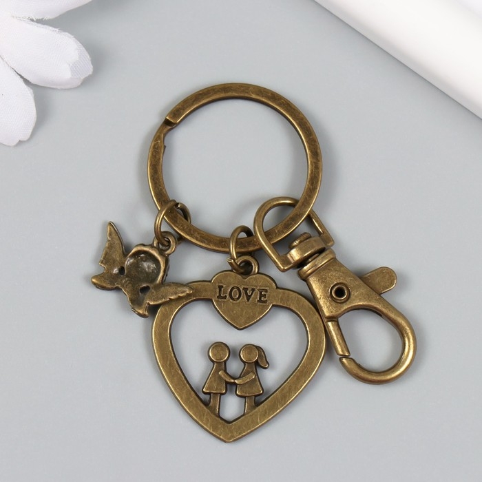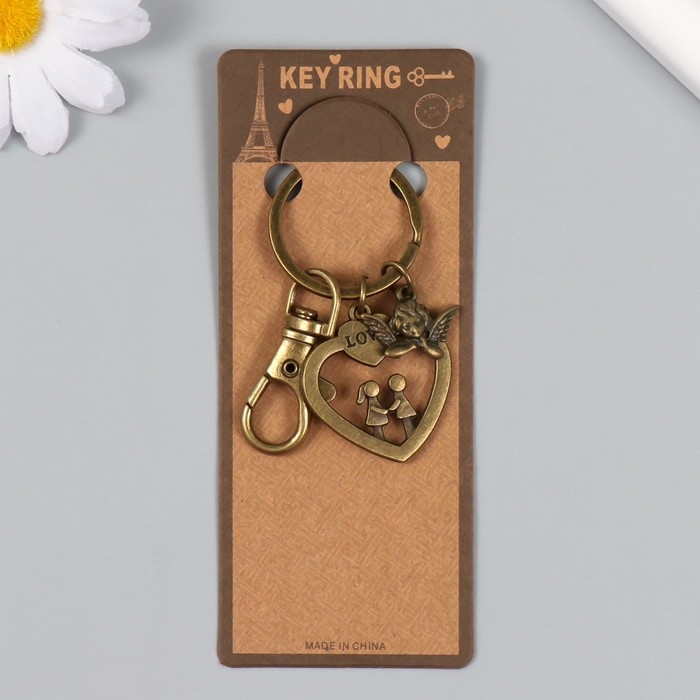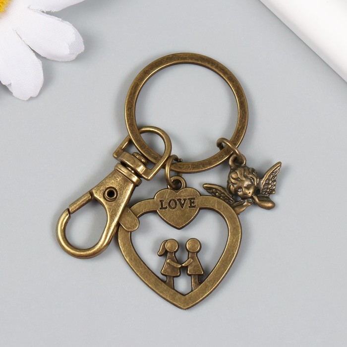 Брелок металл с карабином "Ангел и парочка в сердце" бронза 6 см