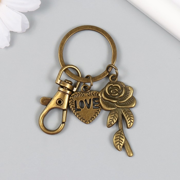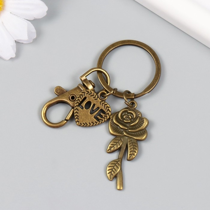 Брелок металл с карабином "Роза и сердце love" бронза 7,4 см