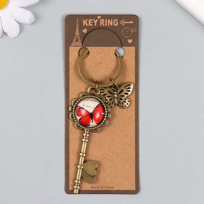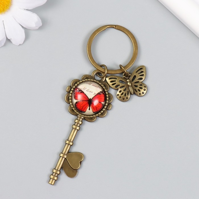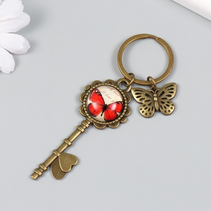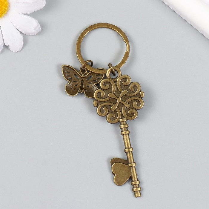Брелок металл, стекло "Бабочка и ключ с бабочкой" бронза 10 см