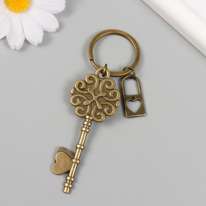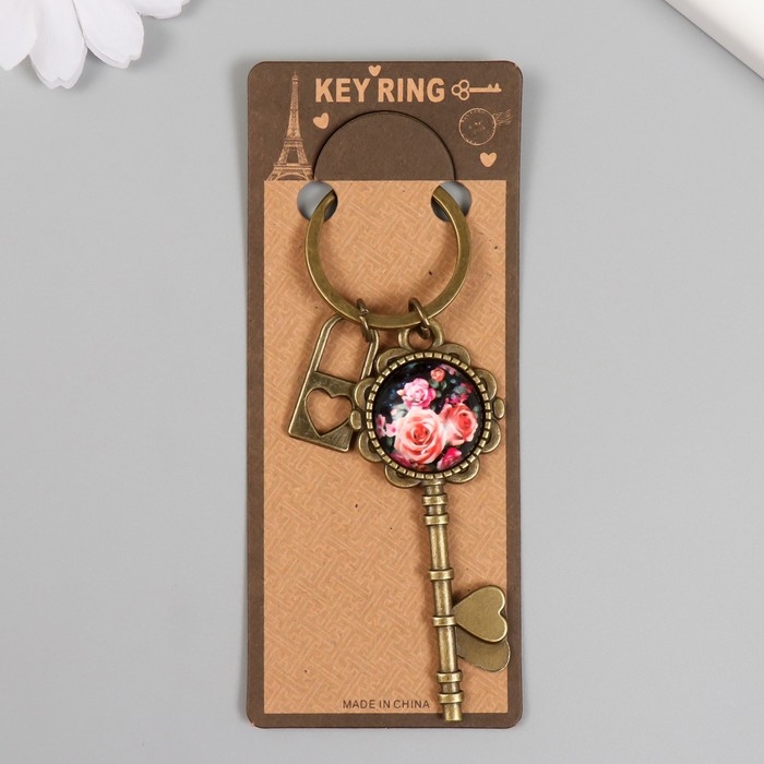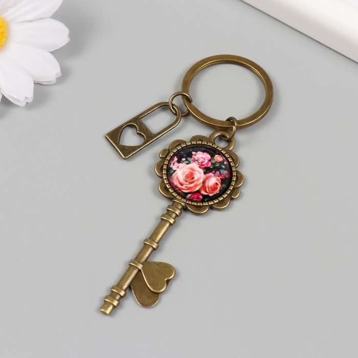 Брелок металл, стекло "Замок с сердцем и ключ с розами" бронза 10 см