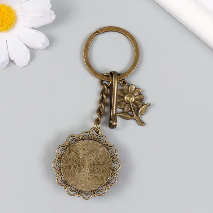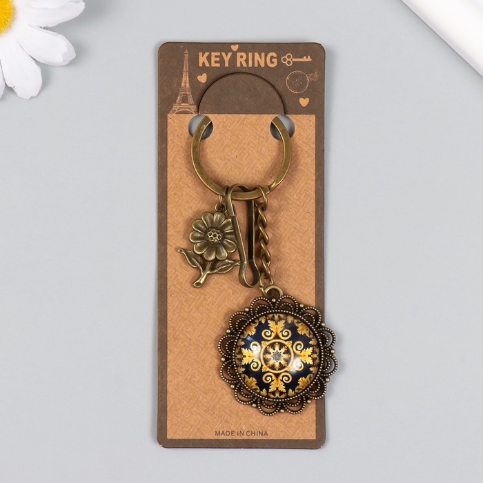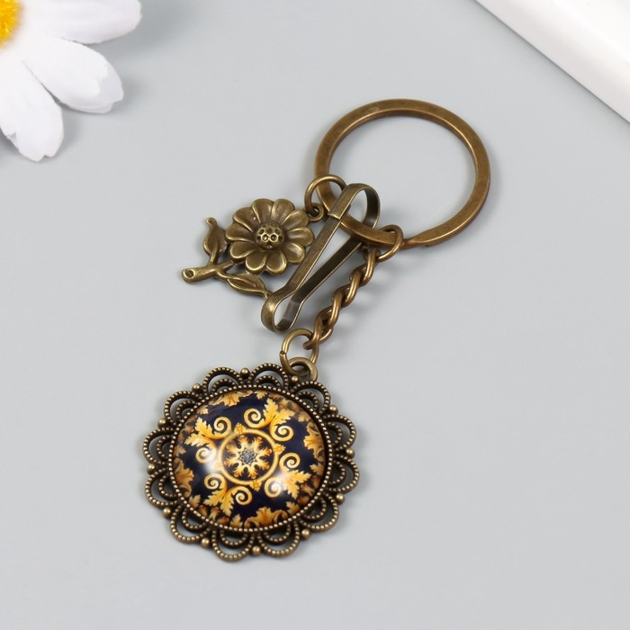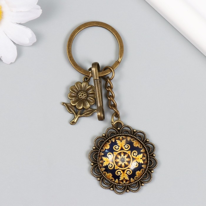 Брелок металл, стекло с карабином "Цветочек и узоры в медальоне" бронза 9,5 см