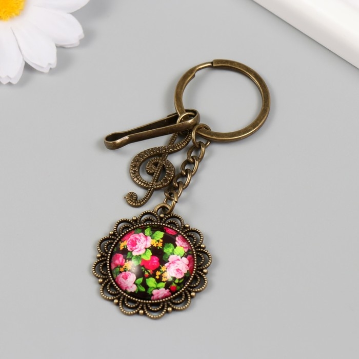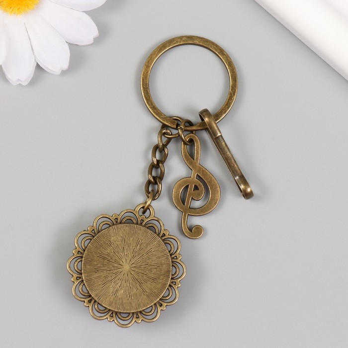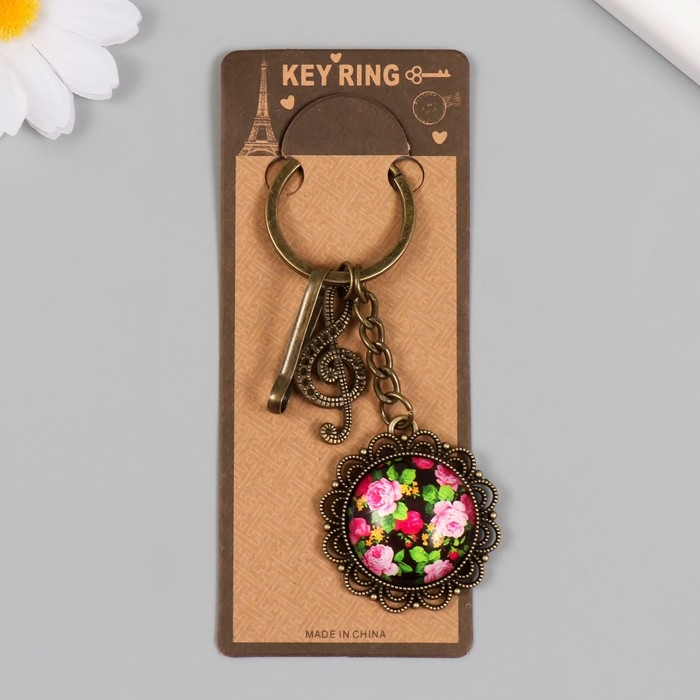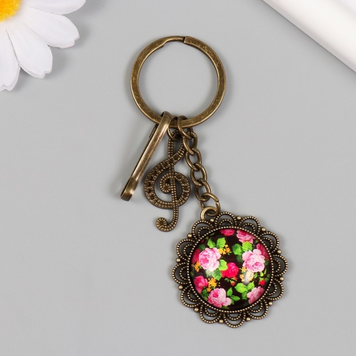Брелок металл, стекло с карабином "Скрипичный ключ и цветы в медальоне" бронза 9,5 см