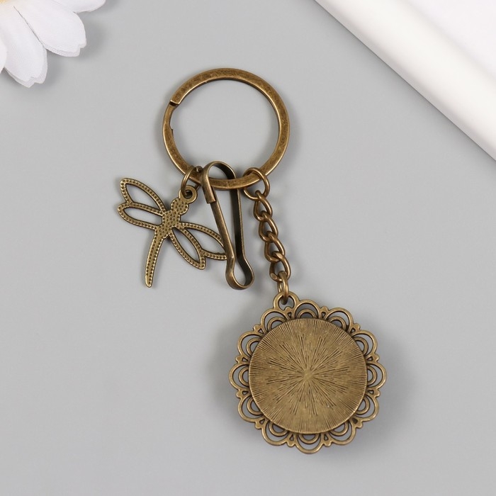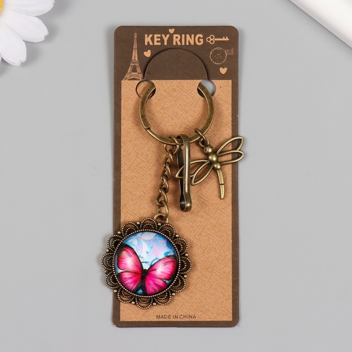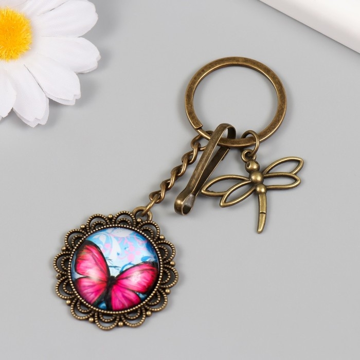 Брелок металл, стекло с карабином "Стрекоза и бабочка в медальоне" бронза 9,5 см