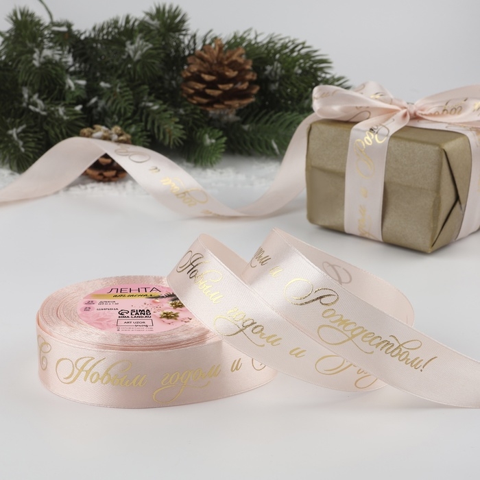 Новый год! Лента атласная с тиснением «С Новым годом и Рождеством», 25 мм, 23 ± 1 м, цвет персиковый